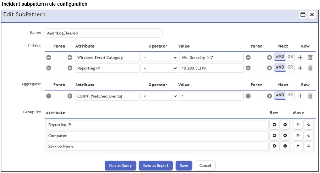 What are the two mistakes in the incident subpattern rule configuration? (Choose two.)