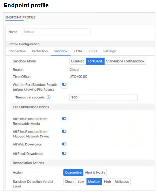 Based on the configuration shown, in which two ways will FortiSASE process sessions that require FortiSandbox inspection? (Choose two.)