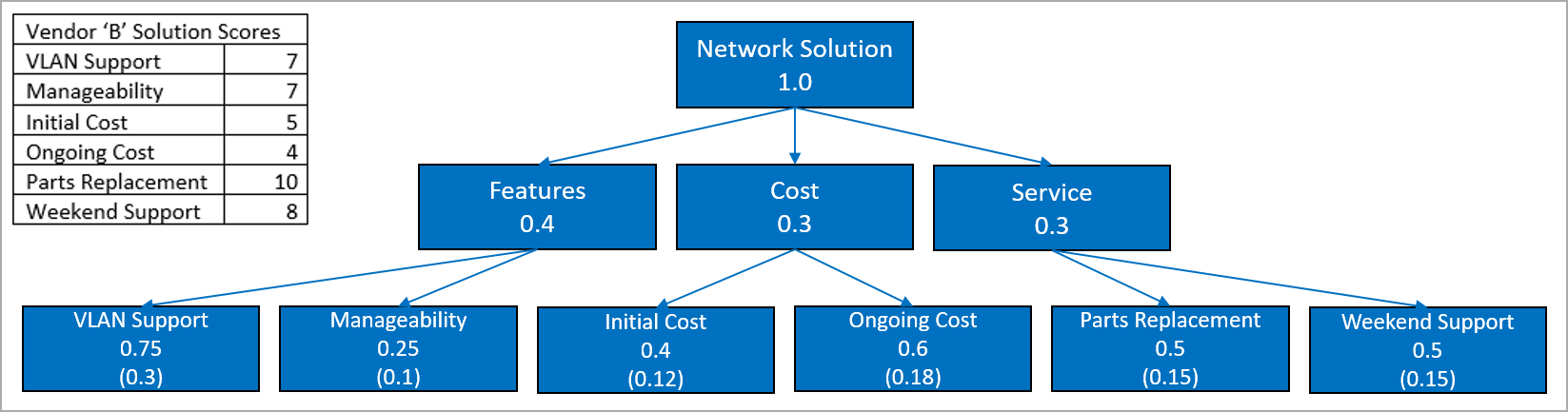 Based on the selection criterion and the vendor table shown below, what is the prioritized score for Features?