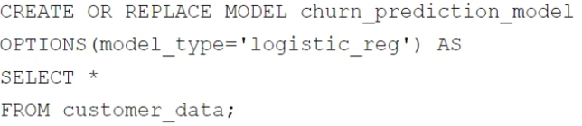 Your retail company wants to predict customer churn using historical purchase data stored in BigQuery. The dataset includes customer demographics, purchase history, and a label indicating whether the customer churned or not. You want to build a machine learning model to identify customers at risk of churning. You need to create and train a logistic regression model for predicting customer churn, using the customer_data table with the churned column as the target label. Which BigQuery ML query should you use?