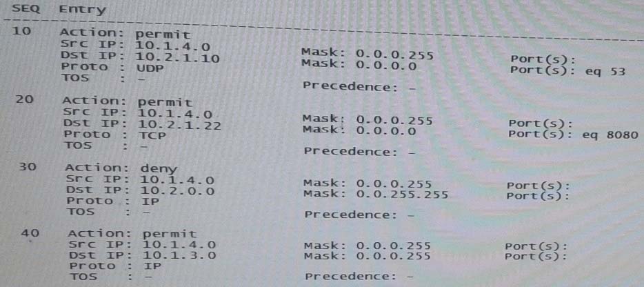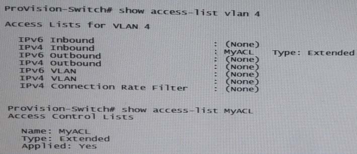 The switch with the ACL shown in the exhibit has IP address 10.1.4/24 on VLAN 4. It is the default router for 10.1.0/24. A client in VLAN 4 broadcast a DHCP discovery request, and the request arrives on this switch.