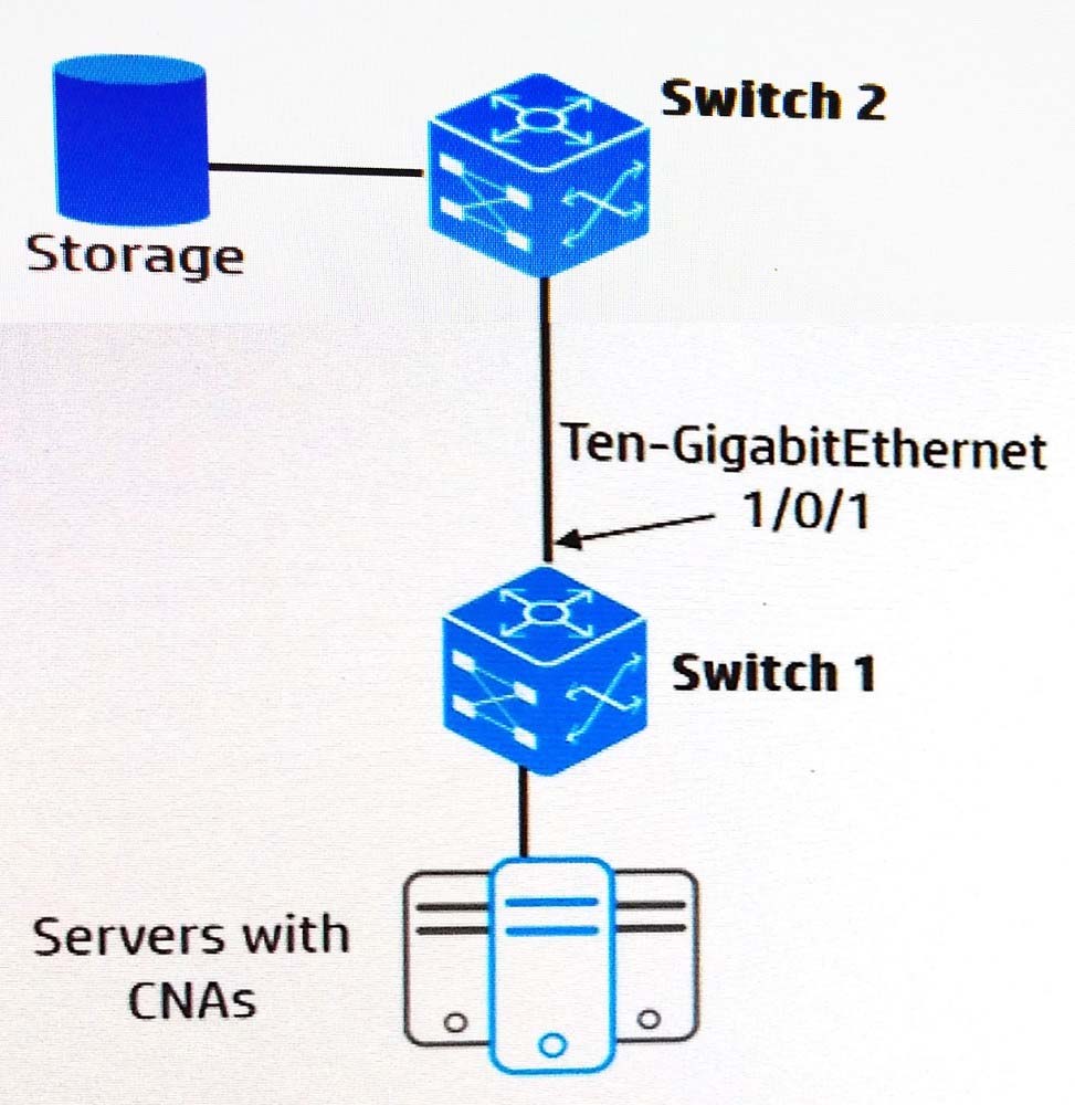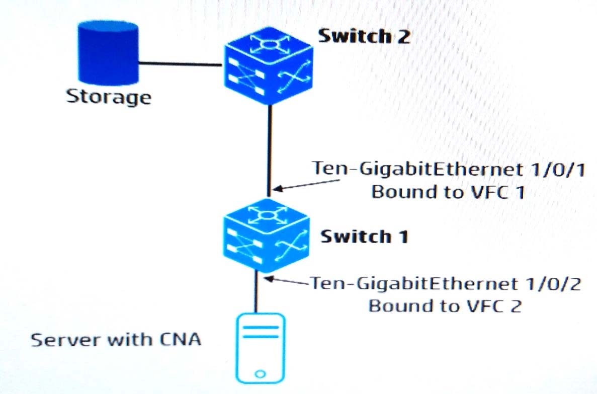 The switches shown in the exhibit are HP Comware switches that support FCoE. The servers access the storage using FCoE. What should be configured on the