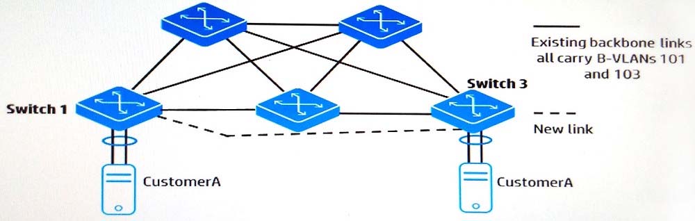The switches in the exhibit are using SPBM. An administrator wants to send CustomerA traffic directly over the new link, shown by the dotted line in the exhibit, as a premium service for that customer. The existing links will be used for backup. The new link is reserved for CustomerA traffic.