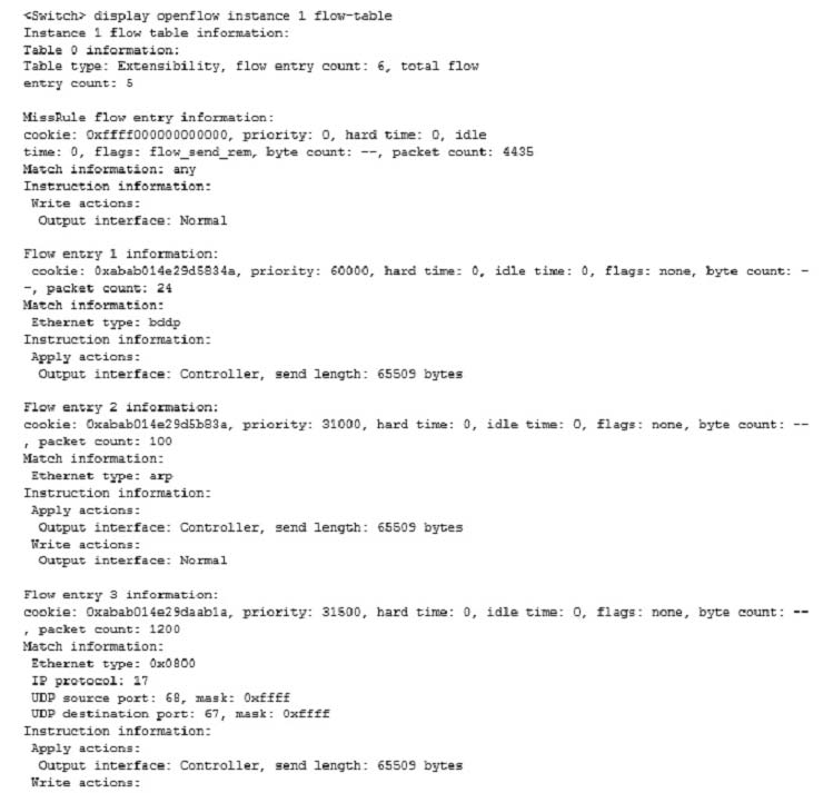 Network clients are configured to use the switch as their default gateway in VLAN 2. The HP Comware switch places VLAN 2 in OpenFlow instance 1. An SDN application has created the flow entry shown in Exhibit 1 to route traffic from 10.1.2.0/24 to 10.1.3.0/24. Exhibit 1 does not show the output interface for the flow.