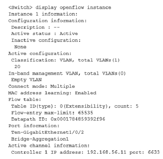 A network administrator has set up an HP VAN SDN Controller to operate in hybrid mode. The administrator wants to confirm that the controller has properly configured an HP Comware switch to be controlled by it in hybrid mode. Which output in the exhibit indicates that the controller is using hybrid mode.