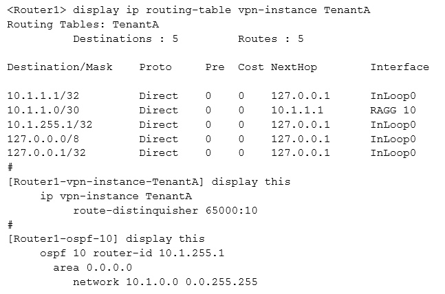 A network administrator is setting up the OSPF routing for VPN instance "TenantA." The configuration shown in this exhibit is not functioning as expected. What must the administrator do to correct the configuration?