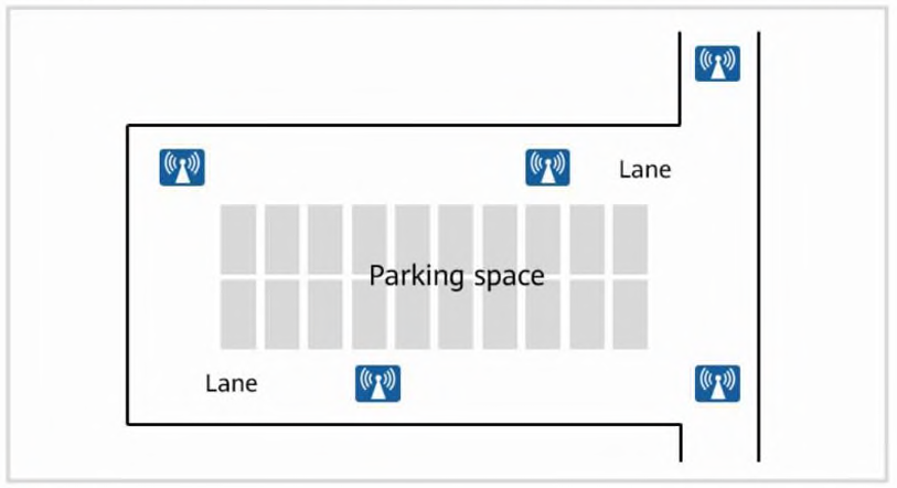In a parking lot scenario as shown in the figure, it is recommended that APs be deployed above lanes and also at intersections to ensure continuous signal coverage.