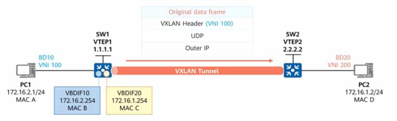 As shown in the figure, SW1 and SW2 use asymmetric IRB forwarding, and PC1 and PC2 communicate with each other. Which of the following is the destination MAC address of the original data frame in the packet sent from VTEP1 to VTEP2?