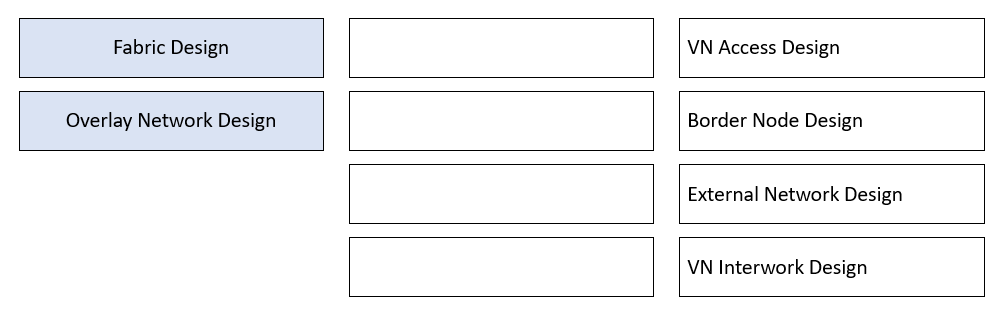 When planning a VXLAN-based virtualized campus network, you need to design underlay, fabric, and overlay networks. Drag the modules on the left to the correct locations on the right. (Token is reusable)