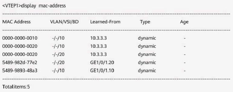 CThe MAC address entry with the outbound interface 10.3.3.3 is learned from the remote VTEP through the VXLAN tunnel.