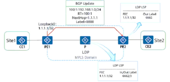As shown in the figure, Site1 and Site2 need to communicate through a carrier's BGP/MPLS IP VPN. A public network tunnel has been established between PE1 and PE2 (label information is shown in the figure). PE1 has advertised the 192.168.1.0/24 route of Site1 to PE2 through MP-IBGR and route learning is normal. What is the top label in a data packet transmitted on the link P -> PE1 if the packet is sent by Site2 to 192.168.1.0/24 of Site1?