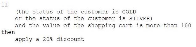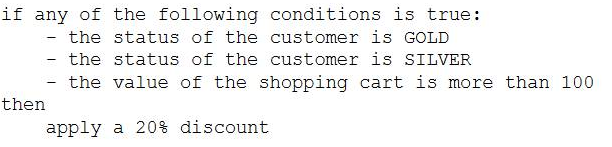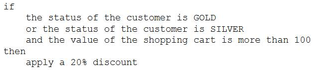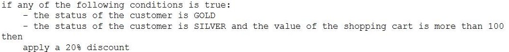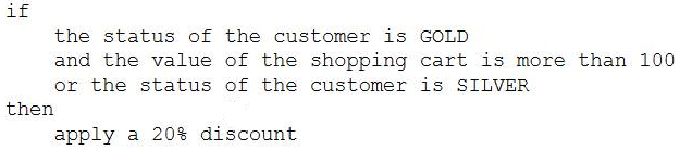 Log In / Sign UpA rule developer needs to write an action rule to apply a 20% discount to customers whose status is GOLD irrespective of the value of their shopping cart or
