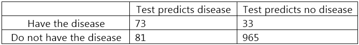 A new test to diagnose a disease is evaluated on 1152 people, and 106 people have the disease, and 1046 people do not have the disease. The test results are summarized below: