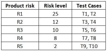 The following table shows the risk level and the test cases associated to the identified product risks (higher risk level means higher risk):