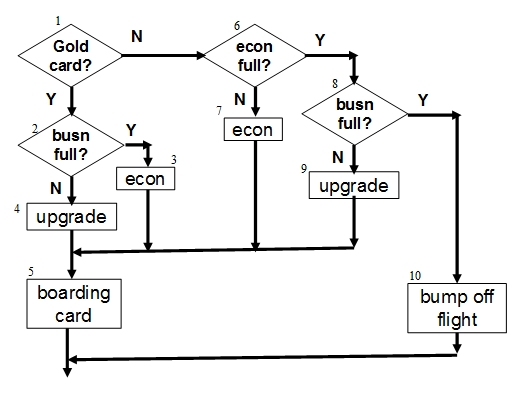 If you are flying with an economy ticket, there is a possibility that you may get upgraded to business class, especially if you hold a gold card in the airlines frequent flier program. If you dont hold a gold card, there is a possibility that you will get bumped off the flight if it is full and you check in late. This is shown in the figure hereafter. Note that each box (i.e. statement) has been numbered.