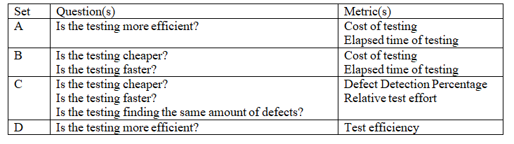 You are a test manager who has set a goal of increasing the efficiency of a regression testing process. You decide to use the GQM approach.