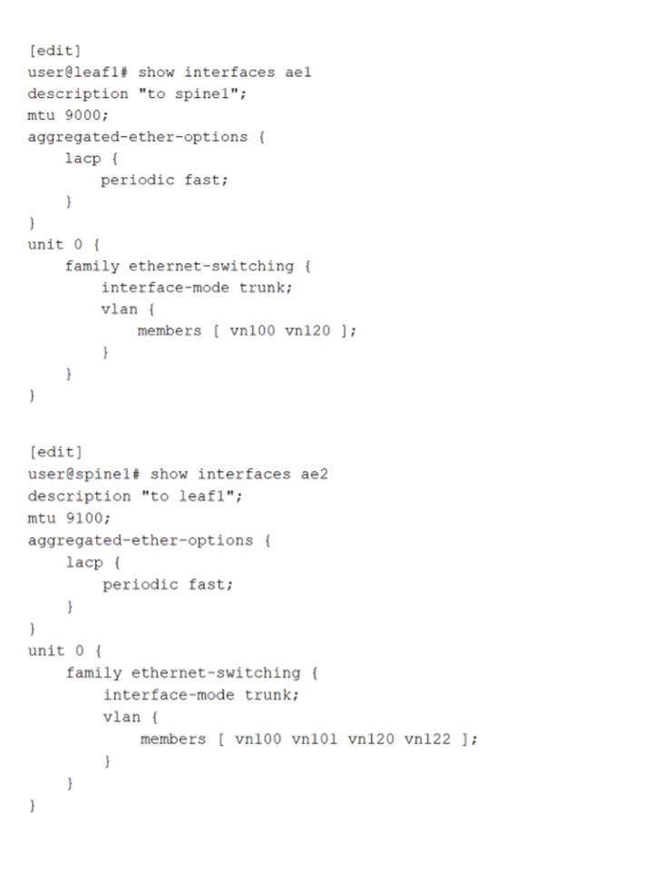 CThe leaf-and-spine VLAN memberships are not consistent and should be changed to include the additional VLANs defined on spine1.