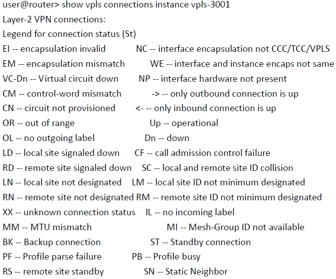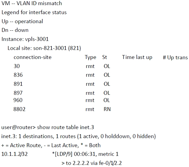 In a newly configured VPLS network, you see the output shown in the exhibit. The remote PE is 10.1.1.2. What is the cause for the OL status?