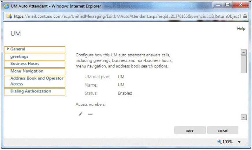 Which option should you configure from the UM Auto Attendant window? To answer, select the appropriate option in the answer area.