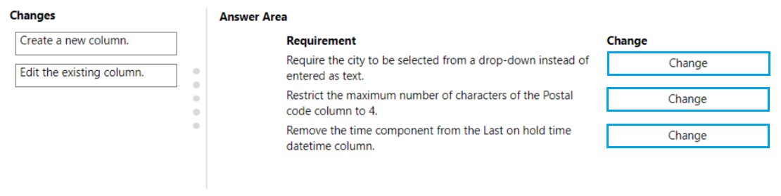Which changes should you make to meet each requirement? To answer, drag the appropriate changes to the correct requirements. Each change may be used once, more than once, or not at all. You may need to drag the split bar between panes or scroll to view content.