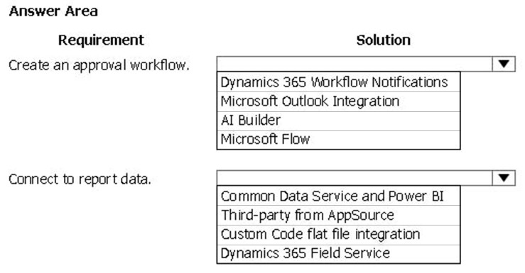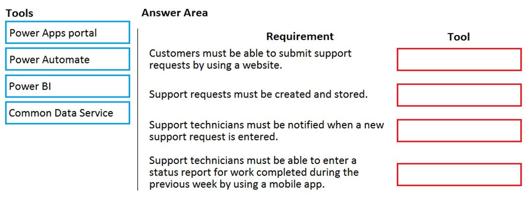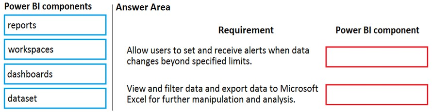 Which Power BI components should the company use? To answer, drag the appropriate Power BI components to the correct requirements. Each Power BI component may be used once, more than once, or not at all. You may need to drag the split bar between panes or scroll to view content.