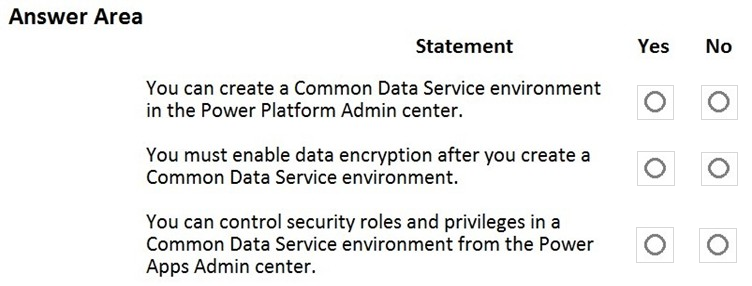 A company plans to create a Common Data Service environment.