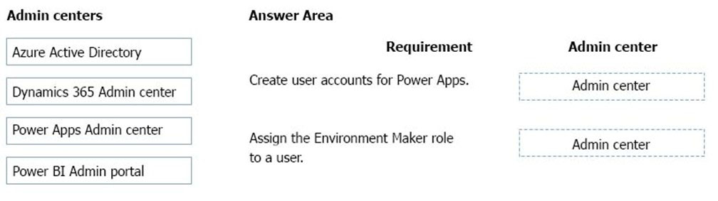 Which admin centers should you use? To answer, drag the appropriate admin centers to the correct requirements. Each admin center may be used once, more than once, or not at all. You may need to drag the split bar between panes or scroll to view content.
