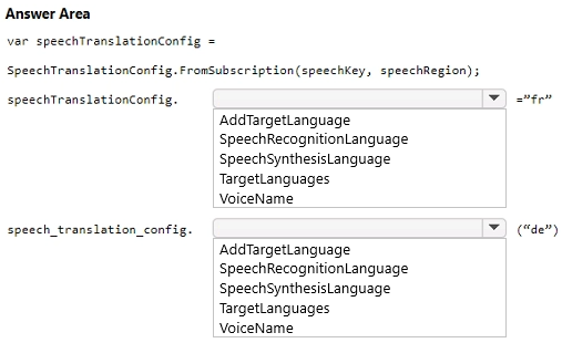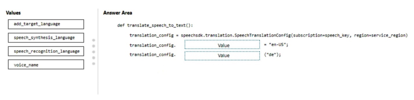 How should you complete the SpeechTranslationConfig object? To answer, drag the appropriate values to the correct targets. Each value may be used once, more than once or not at all. You may need to drag the split bar between panes or scroll to view content.