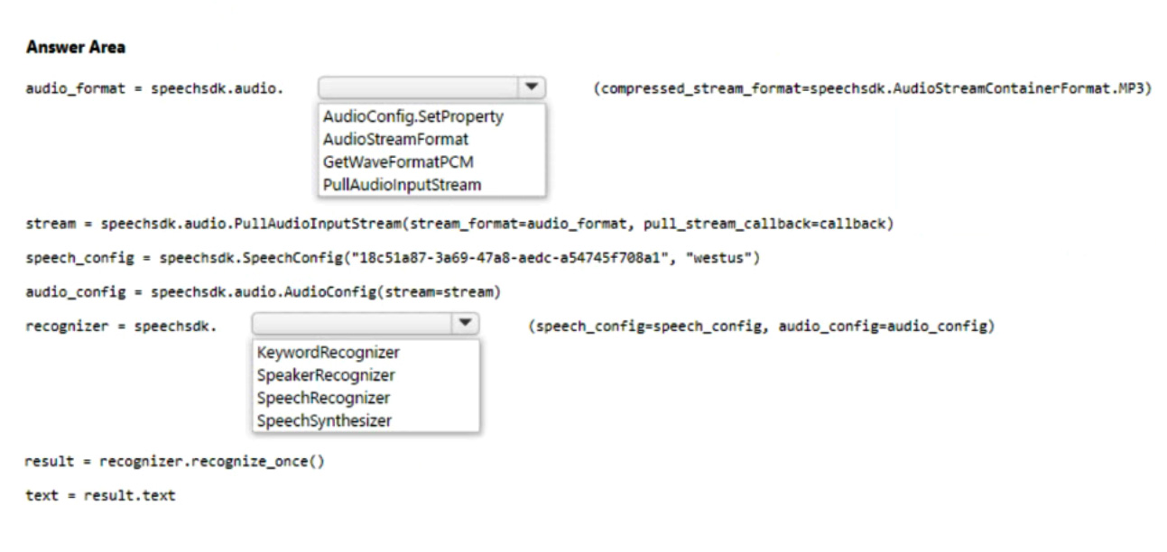 You are developing a streaming Speech to Text solution that will use the Speech SDK and MP3 encoding.