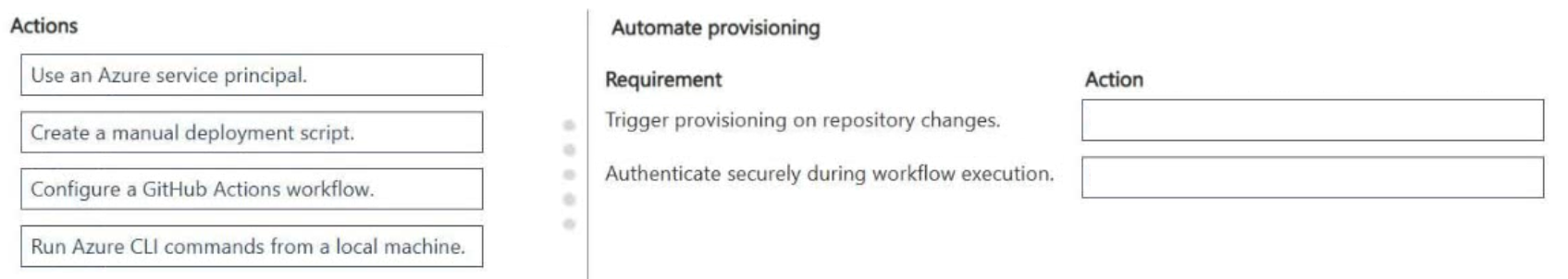 Which action should you take for each requirement? To answer, move the appropriate actions to the correct requirements. You may use each action once, more than once, or not at all. You may need to move the split bar between panes or scroll to view content.