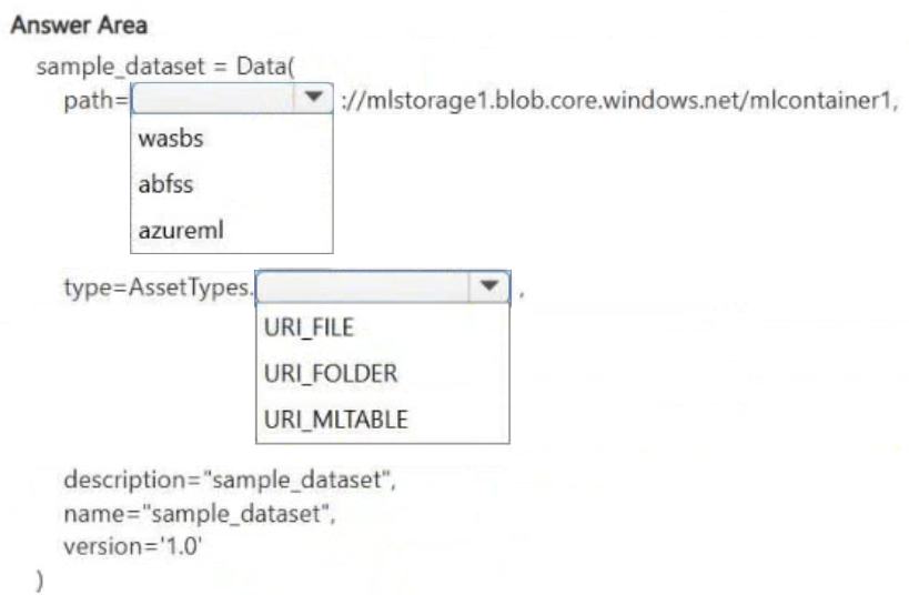 You manage an Azure Machine Learning workspace named workspace1 by using the Python SDK v2. You create a General Purpose v2 Azure storage account named mlstorage1. The storage account includes a publicly accessible container named mlcontainer1. The container stores 10 blobs with files in the CSV format.
