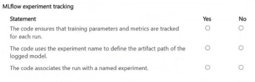 You need to verify whether the training script meets the experiment tracking requirement. For each of the following statements, select Yes if the statement is true. Otherwise, select No.