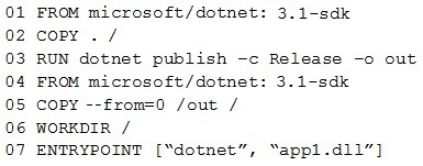 You have a Dockerfile file that contains the following code. (Line numbers are included for reference only.)