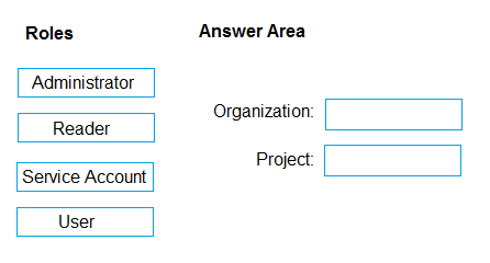 Which role memberships are required for the Azure DevOps organization and the project? To answer, drag the appropriate role memberships to the correct targets. Each role membership may be used once, more than once, or not at all. You may need to drag the split bar between panes or scroll to view content.