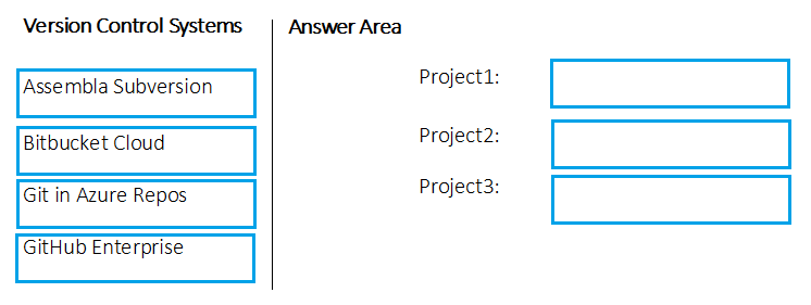 Which version control system should you recommend for each project? To answer, drag the appropriate version control systems to the correct projects. Each version control system may be used once, more than once, or not at all. You may need to drag the split bar between panes or scroll to view content.