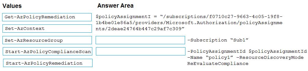 You need to remediate the non-compliant resources in Sub1 based on Policy1.