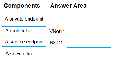 What should you configure for VNet1 and NSG1? To answer, drag the appropriate components to the correct resources. Each component may be used once, more than once, or not at all. You may need to drag the split bar between panes or scroll to view content.