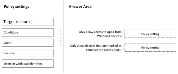 Which Conditional Access policy settings should you configure? To answer, drag the appropriate settings to the correct requirements. Each setting may be used once, more than once, or not at all. You may need to drag the split bar between panes or scroll to view content.