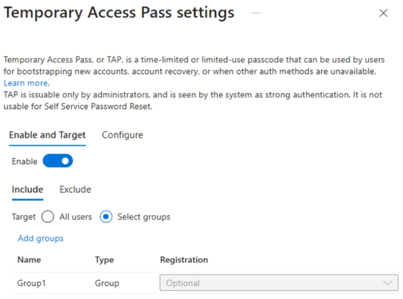 You configure the Temporary Access Pass settings as shown in the following exhibit.