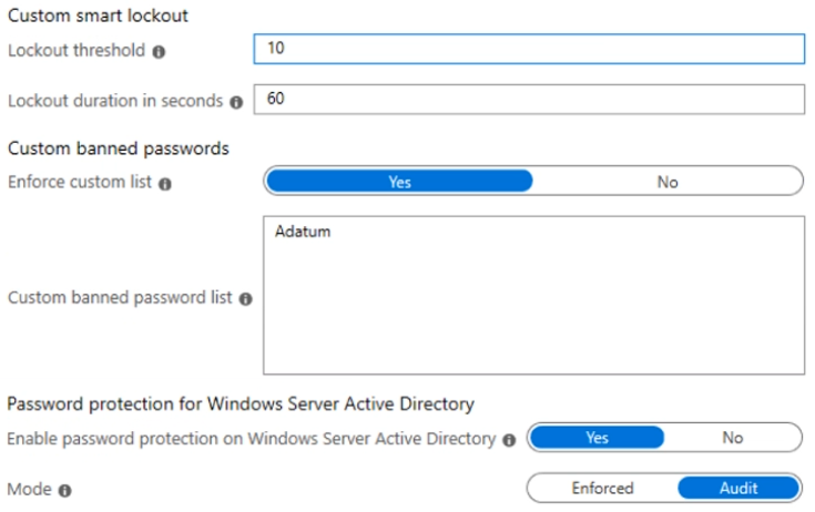 You configure the Microsoft Entra Password Protection settings for adatum.com as shown in the following exhibit.