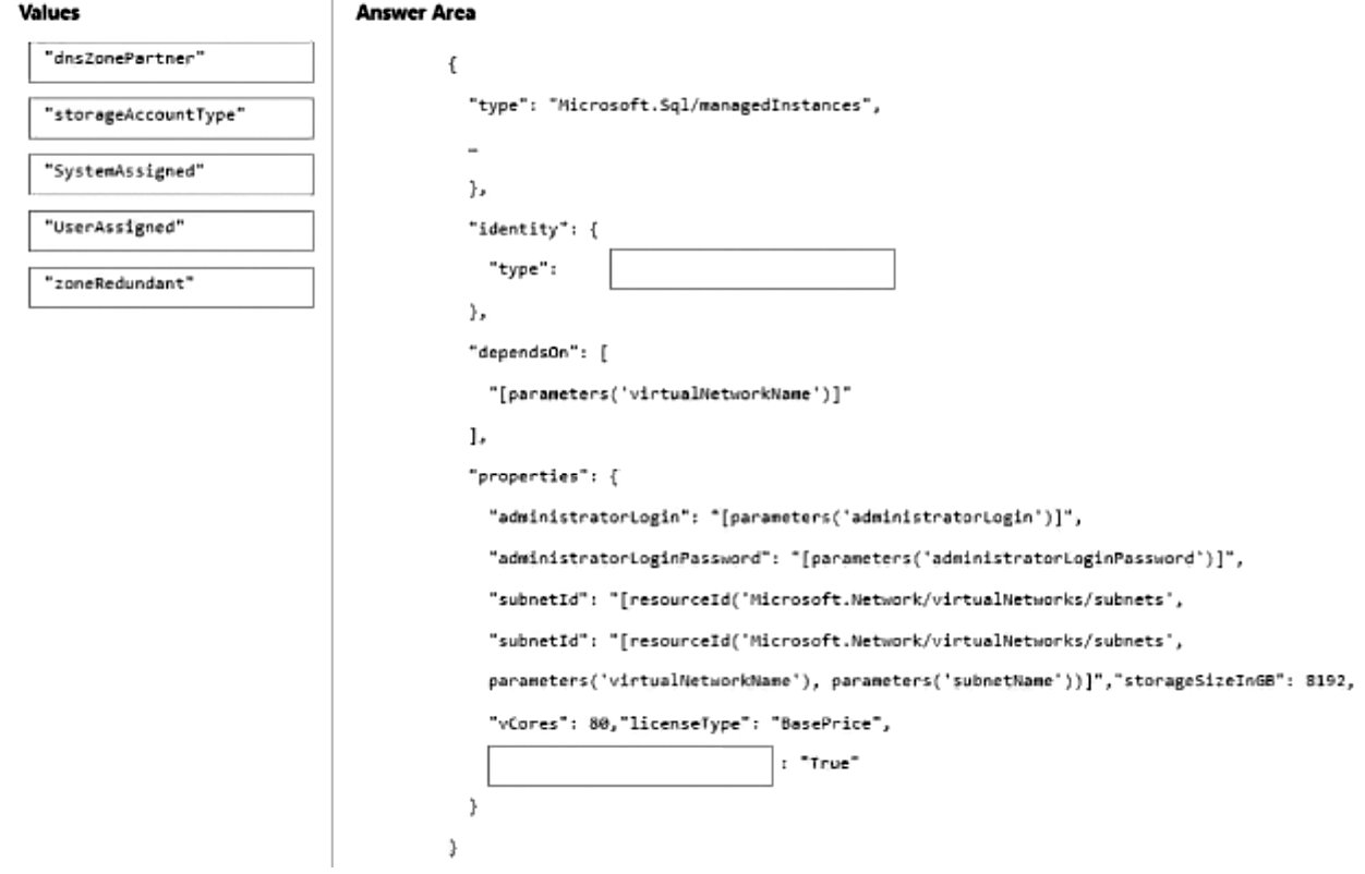 You need to deploy an Azure SQL managed instance by using an Azure Resource Manager (ARM) template. The solution must meet the following requirements: