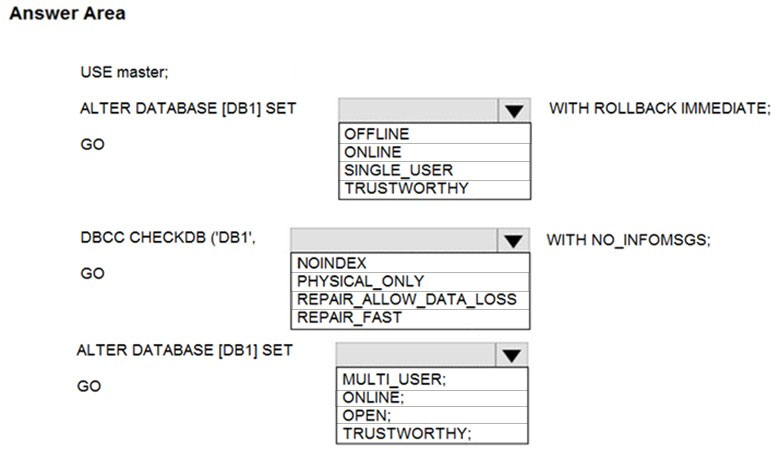 Solution: You run the Remove-AzSqlDatabase PowerShell cmdlet for Database1 on Server2. You run the Restore-AzSqlDatabase PowerShell cmdlet for