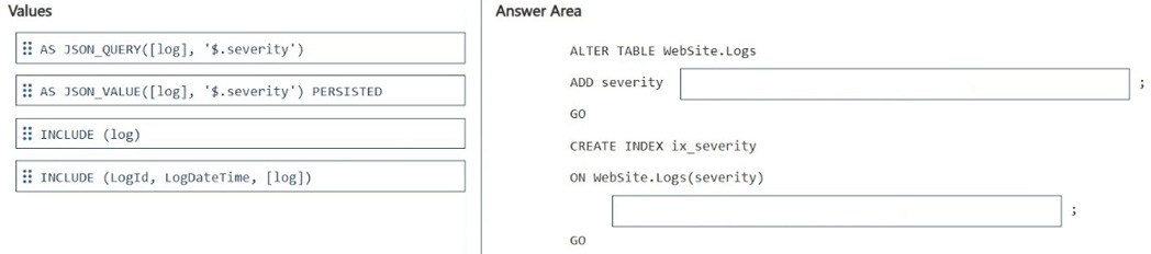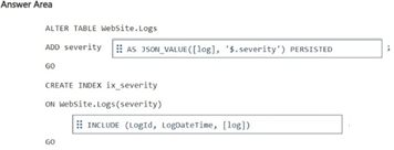 You have a SQL database in Microsoft Fabric that contains a table named WebSite.Logs. WebSite.Logs stores application telemetry data. WebSite.Logs contains a nvarchar (max) column named log that stores JSON documents.