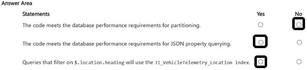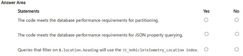 Telemetry data must provide predictable performance for ingestion and retention operations. latitude, longitude, and accuracy JSON properties must be filtered by using an index seek.