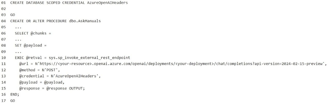 You have a Microsoft SQL Server 2025 instance that contains a database named SalesDB. SalesDB supports a Retrieval Augmented Generation (RAG) pattern for internal support tickets. The SQL Server instance runs without any outbound network connectivity.