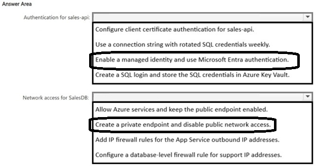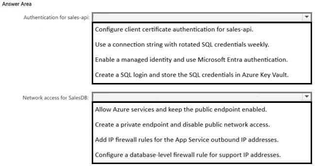 You have an Azure subscription. The subscription contains an Azure SQL database named SalesDB and an Azure App Service app named sales-api. sales-api uses virtual network integration to a subnet named vnet-prod/subnet-app and reads from SalesDB.