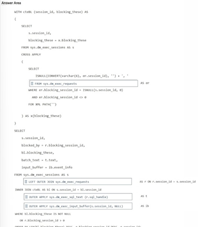 You need to write Transact-SQL code that returns blocking chain details. The output must return only sessions that are blocked or are blocking other sessions.