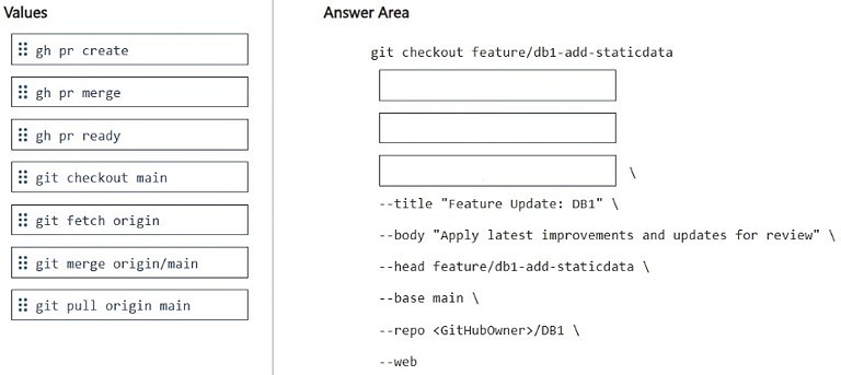 How should you complete the GitHub CLI script? To answer, drag the appropriate values to the correct targets. Each value may be used once, more than once, or not at all. You may need to drag the split bar between panes or scroll to view content.