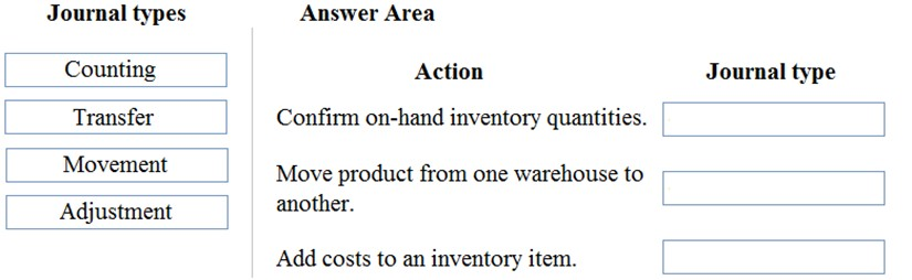 Which journal types should you use? To answer, drag the appropriate journal types to the correct actions. Each journal type may be used once, more than once, or not at all. You may need to drag the split bar between panes or scroll to view content.