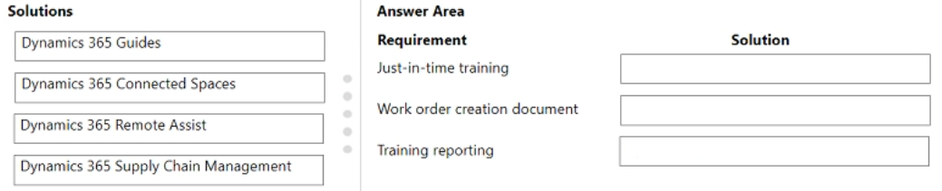Which solution should you implement for each requirement? To answer, drag the appropriate solutions to the correct requirements. Each solution may be used once, more than once, or not at all. You may need to drag the split bar between panes or scroll to view content.